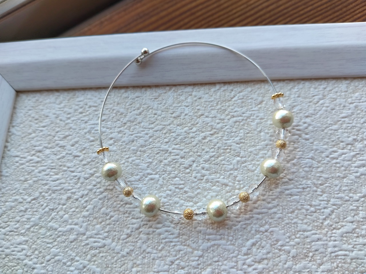 6㎜パールと4㎜のクリアビーズがならぶワイヤーブレスレット。