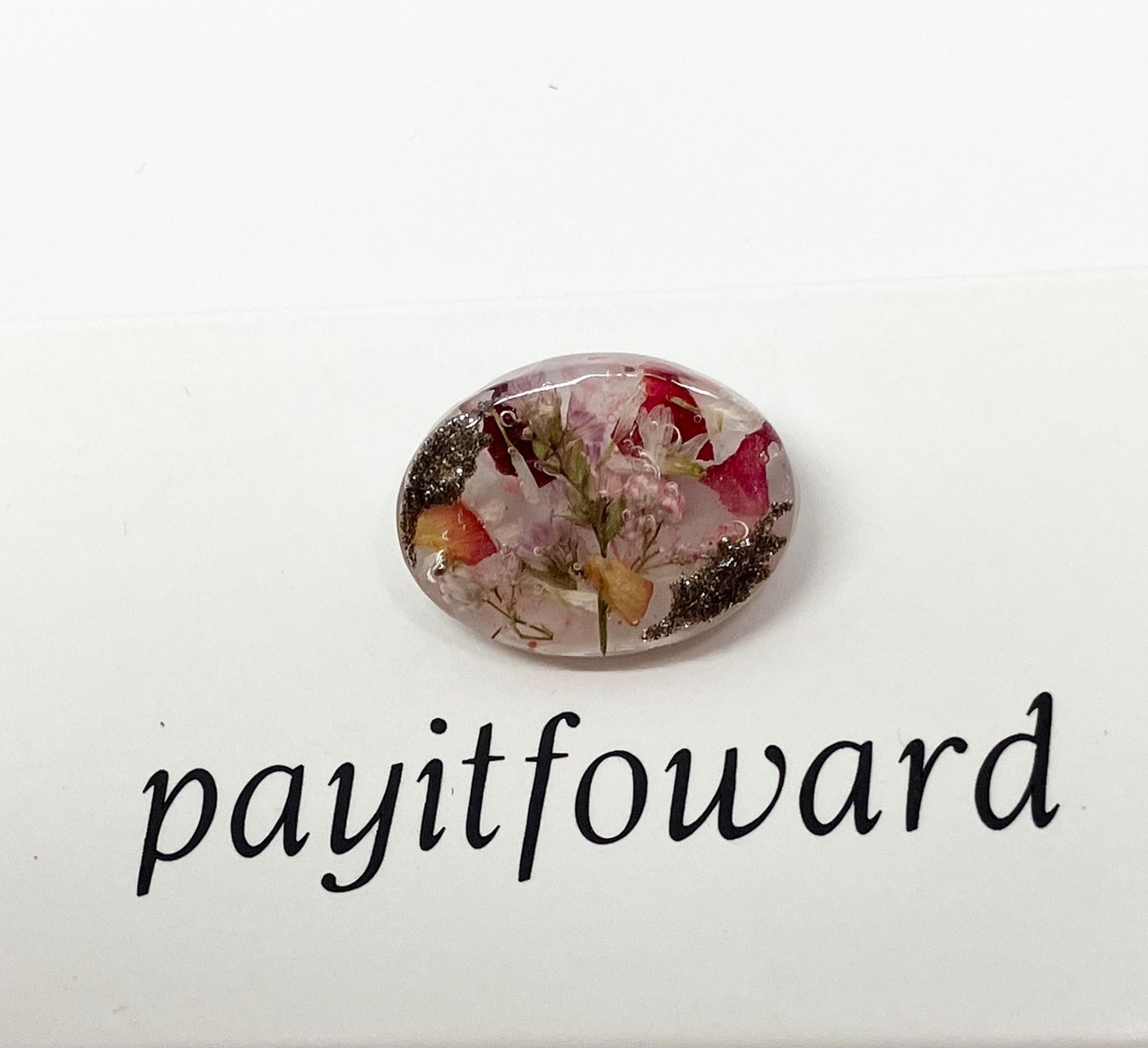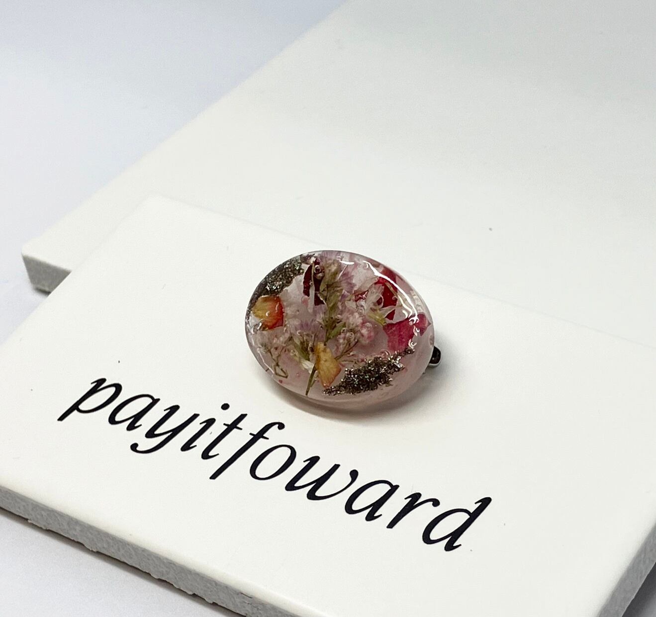 透き通った桃色のレジンに色鮮やかなドライフラワーとラメを散りばめたブローチです。